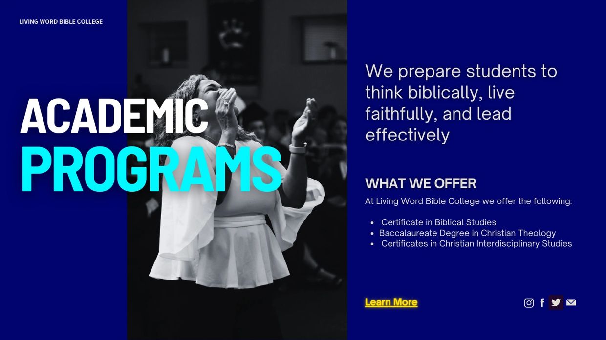 Living Word Bible College offers Spirit-filled, Bible-based academic programs that combine rigorous theological study with hands-on ministry training. Rooted in our Pentecostal heritage, we prepare students to think biblically, live faithfully, and lead effectively—equipped to impact the world for Christ.